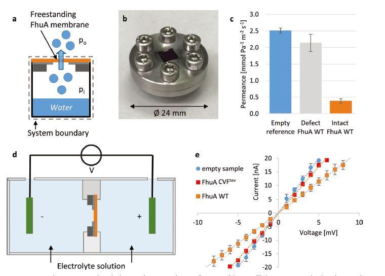 圖5、通過FhuA膜的水和離子滲透。a)覆蓋有氮化硅膜窗口的充水容器的示意圖,其用于測量FhuA WT膜的水滲透。由從杯內(nèi)到杯外的水蒸氣壓差驅(qū)動(dòng)(pi-p0)(a)中所示的杯子的照片。c)FhuA WT膜的水滲透性為3.87×104 mol Pa-1 m?2 s-1(空參考25.13×104 mol Pa-1 m?2 s-1誤差條表示至少三個(gè)樣品的平均值的標(biāo)準(zhǔn)誤差。d)用于測量FhuA膜的離子滲透性的實(shí)驗(yàn)裝置的示意圖。離子在電極之間擴(kuò)散的唯一方式是滲透氮化硅膜窗口中的孔頂部的FhuA膜。e)在磷酸鹽緩沖液(10×10?3 m NaCl,10×10?3 m恒定斜率對(duì)應(yīng)于4.0mS(空參比)、3.4mS(FhuA?CVF)、3.4mS(FhuA?CVF)和3.4mS(FhuA?CVF)的電極之間的恒定電導(dǎo).