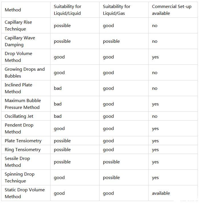有些方法基于動(dòng)力學(xué)原理,因此適合測(cè)量張力隨時(shí)間的變化。其他方法是靜態(tài)或準(zhǔn)靜態(tài)方法,也產(chǎn)生動(dòng)態(tài)張力,但也允許接近液體界面的平衡狀態(tài),因此能夠測(cè)量平衡張力。動(dòng)態(tài)方法需要考慮動(dòng)態(tài)特性的數(shù)據(jù)解釋理論,而靜態(tài)方法的數(shù)據(jù)更容易理解。