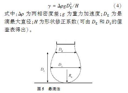 Jyoti等使用軸對(duì)稱液滴形狀分析法(axisymmetricdropshapeanalysis,ADSA)研究單層壓縮速率對(duì)表面張力?表面積等溫線形狀的影響。懸滴法(見(jiàn)圖5)可認(rèn)為是ADSA的雛形,其通過(guò)Laplace方程應(yīng)用于液滴輪廓來(lái)確定懸垂液滴的表面張力和接觸角,懸滴法實(shí)質(zhì)上是滴外形法的一種。滴外形法的基本原理是:當(dāng)液滴在管口形成時(shí),液滴形狀與表面張力存在一定的關(guān)系。懸滴法測(cè)量表面張力可由下列公式計(jì)算:γ=ΔρgD2E/H(4)式中:Δρ為兩相密度差;g為重力加速度;DE為懸滴最大直徑;H為形狀修正系數(shù)(可由DE和DS的值查表得出)。