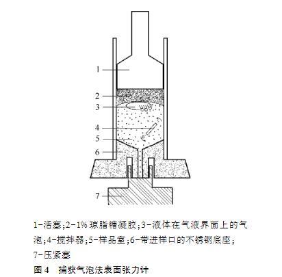 為了避免膜泄漏的出現(xiàn),Schürch等引入了一種防泄漏的捕獲氣泡法表面張力計(jì)。在捕獲氣泡法裝置中(見(jiàn)圖4),待測(cè)液體充滿樣品室,樣品室頂部鍍有一親水性瓊脂糖凝膠,從底部進(jìn)樣口引入的氣泡在浮力作用下上升并緊靠瓊脂糖凝膠層,同時(shí)氣泡和凝膠層之間由于液體樣品薄層的阻隔,故不會(huì)黏附于凝膠層之上。氣泡的體積通過(guò)改變樣品室中的壓力來(lái)控制。隨著氣泡體積減小,表面積減小,氣泡表面張力下降。氣泡形狀隨表面張力的變化而變化,從球形到橢圓形。對(duì)于初始直徑大于5mm氣泡,當(dāng)表面張力趨于0時(shí),氣泡呈薄圓盤狀。測(cè)量時(shí),通過(guò)推動(dòng)活塞改變樣品室的壓力來(lái)控制氣泡體積,并用視頻記錄氣泡體積變化。最后從視頻圖像中測(cè)得氣泡的高度和直徑,利用Malcolm等提出的方法計(jì)算氣液界面的表面張力、氣泡體積和表面積。