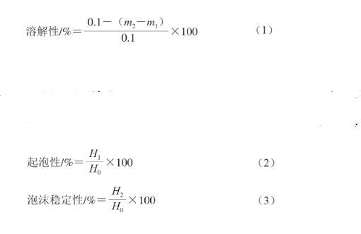 樣品分散于蒸餾水中制成質(zhì)量濃度為1 g/100 mL的蛋白溶液。取20 mL樣品溶液放置于50 mL燒杯中,記錄初始高度(H0),以13 500 r/min高速間歇攪打2 min,立刻記錄此時(shí)泡沫高度H1,室溫下靜置30 min后的記錄泡沫高度H2。起泡性和泡沫穩(wěn)定性按照式(2)、(3)計(jì)算:
