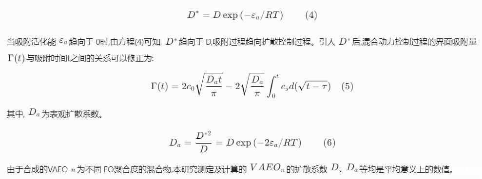 擴(kuò)散控制的吸附過(guò)程,表面活性劑分子由濃度差驅(qū)使進(jìn)入新表面,不存在吸附勢(shì)壘。Word-Tordai方程描述了界面吸附量Г(t)與吸附時(shí)間t的關(guān)系:Г(t)=2c0Dtπ-2Dπ∫t0csd(t-τ)(1)式中,c0是溶液本體表面活性劑濃度,mol/L,D是單分子擴(kuò)散系數(shù),m2/s,cs是次表面表面活性劑濃度,mol/L,τ是整合虛設(shè)變量。方程(1)不能直接求解,可通過(guò)極限法求解。在t→0時(shí),表面張力γ(t)近似于溶劑表面張力γ0,表面吸附接近平衡時(shí),γ(t)近似于靜態(tài)表面張力γeq.Fainerman等用漸近的方法對(duì)方程(1)進(jìn)行轉(zhuǎn)化:γ(t→0)=γ0-2nRTc0Dtπ(2)γ(t→∞)=γeq+nRTГ2eqcπ4Dt(3)方程(3)中,t→∞時(shí),c=c0,Γeq表示靜態(tài)表面張力達(dá)到平衡時(shí)的表面吸附量?;旌蟿?dòng)力擴(kuò)散吸附是指表面活性劑分子從本體擴(kuò)散到次表面仍然遵循擴(kuò)散機(jī)理,但從次表面層擴(kuò)散到表面層時(shí)需克服一定的勢(shì)壘。Liggieri和Ravera[15,16]提出,次表面層中的分子,只有能量大于吸附活化能εa才能被吸附到表面,已吸附的分子,只有能量大于解吸活化能εb才能被解吸。以Word-Tordai方程為基礎(chǔ),引入矯正擴(kuò)散系數(shù)D?。矯正擴(kuò)散系數(shù)D?和擴(kuò)散系數(shù)D關(guān)系定義為:D?=Dexp(——εa/RT)(4)當(dāng)吸附活化能εa趨向于0時(shí),由方程(4)可知,D?趨向于D,吸附過(guò)程趨向擴(kuò)散控制過(guò)程。引入D?后,混合動(dòng)力控制過(guò)程的界面吸附量Г(t)與吸附時(shí)間t之間的關(guān)系可以修正為:Г(t)=2c0Datπ-2Daπ∫t0csd(t-τ)(5)其中,Da為表觀擴(kuò)散系數(shù)。Da=D?2D=Dexp(——2εa/RT)(6)由于合成的VAEOn為不同EO聚合度的混合物,本研究測(cè)定及計(jì)算的VAEOn的擴(kuò)散系數(shù)D、Da等均是平均意義上的數(shù)值。