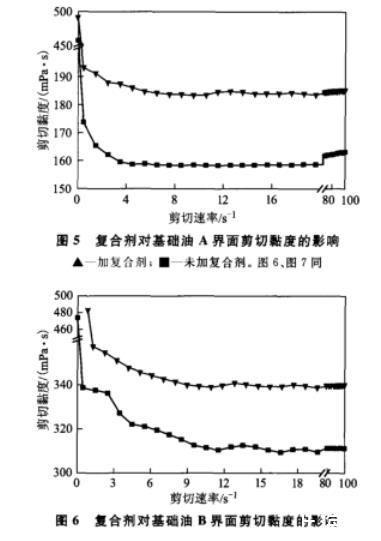 圖6復(fù)合劑對基礎(chǔ)油B界面剪切黏度的影響