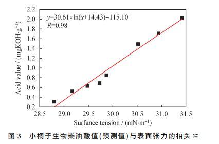 由圖2可知,擬合后得到的方程為y=0.69x-19.61,相關(guān)系數(shù)R=0.99,說明表面張力與酸值的相關(guān)度比較高。綜合圖1、圖2可知,氧化時間、表面張力、酸值三者之間的相關(guān)性較高,因此表面張力可作為評估生物柴油降解階段的參數(shù),可用于預(yù)測其酸值。
