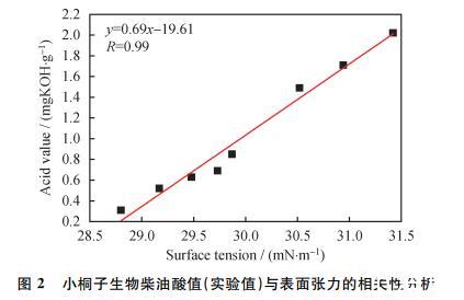 同時,對樣品的酸值與表面張力進(jìn)行了相關(guān)性分析,如圖2所示: