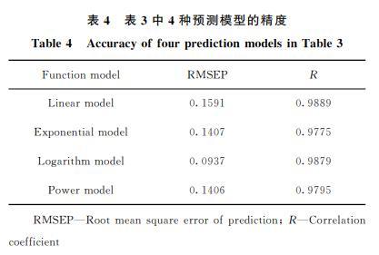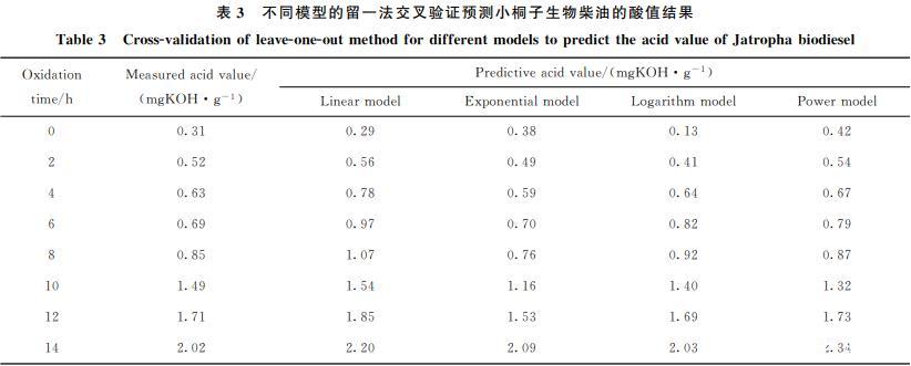 留一法交叉驗(yàn)證是建立預(yù)測模型的一種常用方法,從N個觀測數(shù)據(jù)中選擇一個觀測數(shù)據(jù)作為驗(yàn)證數(shù)據(jù),然后使用剩下的(N-1)個觀測數(shù)據(jù)擬合一個模型,并用驗(yàn)證數(shù)據(jù)來驗(yàn)證模型的精度,如此重復(fù)N次??紤]到數(shù)據(jù)量以及相關(guān)性,筆者利用Excel建立了線性、指數(shù)、對數(shù)、乘冪4種預(yù)測模型,對小桐子生物柴油酸值的預(yù)測結(jié)果見表3。