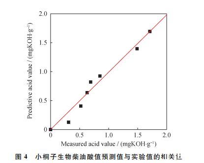 圖4為小桐子生物柴油的酸值實(shí)驗(yàn)值與對數(shù)模型預(yù)測值的函數(shù)關(guān)系: