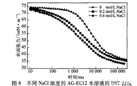 平衡張力研究表明,三種烷基糖苷檸檬酸單酯鹽在其各自的水溶液中均具有表面活性。動態(tài)表面張力研究表明,同摩爾濃度AG—EC08、AG.ECIO和AG—EC12水溶液的動態(tài)表面活性在達到一定時間后隨表面活性劑分子的疏水鏈增長而不斷增大;AG—EC溶液的濃度越高,其動態(tài)表面活性越好,DST越快平衡,DST曲線越低。而當溫度升高,其DST明顯下降;無機電解質(zhì)NaC1對其DST的影響也較明顯,隨著NaC1濃度增大,其DST曲線越低。