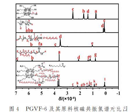 圖4為PGVF-6以及其原料的核磁共振對(duì)比圖。PGVF-6譜圖中,SH-POSS上的-SH質(zhì)子氫吸收峰已經(jīng)消失,接枝成功的APEG750單體,烯烴雙鍵的質(zhì)子氫吸收峰已經(jīng)消失,末端連接的-OH質(zhì)子氫吸收峰在5.21times 10^{-6}處;同樣反應(yīng)成功的2-壬烯酸甲酯單體,烯烴雙鍵的質(zhì)子氫吸收峰也同樣消失不見,連接O的末端烷烴-CH3質(zhì)子氫吸收峰處于3.72x10-6的位置,末端烷烴-CH3的質(zhì)子氫吸收峰在0.88x10-6處;最后成功反應(yīng)的VDMS單體,烯烴雙鍵的質(zhì)子氫吸收峰也已經(jīng)消失,后續(xù)Si上連接的所有甲基-CH3分別處在0.12x10-6和0.08x10-6處,可以得知PGVF-6雜化材料成功合成。