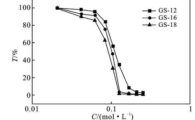 2.2.2耐鹽性能隨著鹽濃度的增加,濁度的突然增加是表面活性劑溶液中宏觀相分離的標(biāo)志,這就是鹽析現(xiàn)象[7,11]。圖4為KBr/GS表面活性劑溶液,隨著KBr含量的增加,在波長為500 nm的吸光度變化曲線。以GS-12為例,當(dāng)KBr濃度為0~60 mmol/L時(shí),1 mmol/L的Gemini表面活性劑水溶液為無色透明,濁度同時(shí)略有下降,說明有混合膠束形成。當(dāng)KBr的濃度從60 mmol/L增加到120 mmol/L時(shí),溶液呈現(xiàn)微渾濁,說明體系中有少量的表面活性劑顆粒析出。而GS-16,GS-18在更低的濃度下就發(fā)生了鹽析現(xiàn)象。也就是說,鹽的析出現(xiàn)象是非常復(fù)雜的,這不僅取決于鹽的性質(zhì),而且取決于雙子表面活性劑的結(jié)構(gòu)[12-13]。此外,由圖4透過率的變化可知,隨著疏水鏈的增長,表面活性劑的耐鹽性能減弱,更容易受鹽濃度的影響。因?yàn)闊o機(jī)鹽消除離子頭基團(tuán)的電荷,減少吸附膜內(nèi)頭基基團(tuán)與膠束之間的靜電排斥。它們通過減少頭基之間的靜電相互作用和最小化有效截面積來促進(jìn)膠束的產(chǎn)生和聚集,導(dǎo)致表面活性劑從溶液中聚沉而析出[13]。
