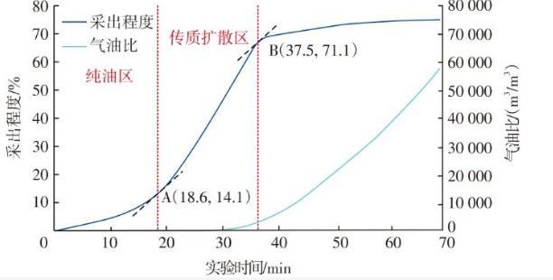 總結(jié)以上分析認(rèn)為,CO2驅(qū)生產(chǎn)動(dòng)態(tài)規(guī)律為:在CO2驅(qū)替前緣未達(dá)到井口前采出端為純油流,此階段CO2-原油體系作用時(shí)間短,溶解降黏、萃取等作用效果不明顯,因此采油速度小、單井產(chǎn)量低且油井不見氣,如圖6中的純油區(qū),該區(qū)域主要依靠CO2驅(qū)動(dòng)力采油,采出程度曲線呈緩慢上升驅(qū)勢(shì)。隨著開發(fā)推進(jìn),CO2-原油體系作用時(shí)間增加,溶解降黏、萃取等作用逐漸占據(jù)主要作用,原油黏度減小,此時(shí)油井開始緩慢見氣。如圖6中的傳質(zhì)擴(kuò)散區(qū),油井產(chǎn)量增加,采油速度加快,采出程度曲線快速上升。在純油區(qū)向傳質(zhì)擴(kuò)散區(qū)過(guò)渡階段,采出程度曲線上存在一切點(diǎn)(圖6中A點(diǎn)),其對(duì)應(yīng)的時(shí)間18.6 min為見氣時(shí)間,對(duì)應(yīng)的采出程度14.1%為純油區(qū)推進(jìn)至井口時(shí)的采出程度。隨著CO2驅(qū)的持續(xù)進(jìn)行,傳質(zhì)擴(kuò)散區(qū)大部分已經(jīng)推進(jìn)至采油井附近,油井產(chǎn)氣量迅速增大的同時(shí)產(chǎn)油量迅速減小,采出程度緩慢增加直至穩(wěn)定。在傳質(zhì)擴(kuò)散區(qū)采出的末段,采出程度曲線上存在一切點(diǎn)(圖6中B點(diǎn)),該點(diǎn)所對(duì)應(yīng)的時(shí)間37.5 min近似為驅(qū)油結(jié)束時(shí)間,此時(shí)對(duì)應(yīng)的采出程度71.1%為傳質(zhì)擴(kuò)散區(qū)推進(jìn)至井口時(shí)的采出程度。此后氣油比迅速增大,CO2驅(qū)油進(jìn)入末期。