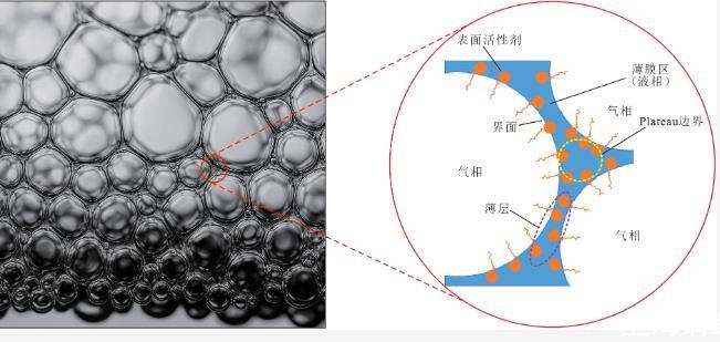 泡沫是一種熱力學不穩(wěn)定的膠體體系,其中氣體分散在表面活性劑穩(wěn)定的連續(xù)液相中,可以自發(fā)破裂。圖1顯示由表面活性劑形成的典型泡沫結(jié)構(gòu)。提高CO2泡沫的穩(wěn)定性具有挑戰(zhàn)性,因為在高壓儲層條件下,CO2更易溶于水,溶解的CO2會引起泡沫的團聚。