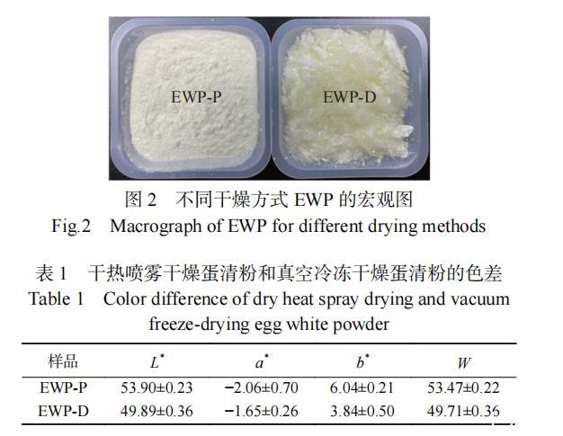 如圖2所示,EWP-P為細膩的鵝黃色顆粒粉末,EWP-D為松散的黃色片狀物。EWP-P的L*、a*和b*值分別為53.90±0.23、?2.06±0.70和6.04±0.21。EWP-D的L*、a*和b*值分別為49.89±0.36、?1.65±0.26和3.84±0.50(表1)。EWP-P的b*值較大是因為蛋清蛋白中的葡萄糖在噴霧干燥過程中與蛋白發(fā)生了美拉德反應(yīng)。此外,真空冷凍干燥需將樣品進行冷凍預(yù)處理,冷凍過程中,蛋清蛋白會發(fā)生褐變反應(yīng),故EWP-D最終呈現(xiàn)出的顏色較EWP-P黃(圖2)。EWP-P的顏色較EWP-D白(圖2),可能是因為干熱噴霧干燥的干燥速度快,蛋清中的蛋白質(zhì)受熱時間短。因此在本實驗干燥條件下,干熱噴霧干燥所得的蛋清蛋白粉更亮、更白,易被消費者接受。