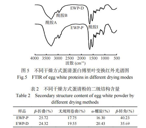 不同干燥方式蛋清蛋白的紅外光譜如圖5所示。EWP-P和EWP-D在酰胺A帶(3700~3200 cm?1)處有強吸收峰,EWP-P的峰強大于EWP-D,表明干燥方式會影響蛋清蛋白的水合能力,這可能與蛋白質(zhì)分子中N-H鍵舒展并與氫鍵形成了締合體,或蛋白質(zhì)分子與葡萄糖以共價鍵結(jié)合有關(guān)。酰胺B帶(2961.64 cm?1)的弱吸收峰主要由C-N鍵產(chǎn)生。酰胺I帶(1600~1700 cm?1)信號主要由C-O鍵伸縮振動引起,與蛋白質(zhì)的二級結(jié)構(gòu)有關(guān),涉及β-折疊(1600~1640 cm?1)、無規(guī)則卷曲(1640~1650 cm?1)、α-螺旋(1650~1660 cm?1)和β-轉(zhuǎn)角(1660~1700 cm?1)。采用Peak fit軟件對不同干燥方式蛋清蛋白的酰胺I帶峰強進行高斯曲線擬合分析,根據(jù)峰面積計算其二級結(jié)構(gòu)的相對百分含量,結(jié)果如表2。EWP-P和EWP-D的二級結(jié)構(gòu)以β-折疊和β-轉(zhuǎn)角為主,EWP-P的β-折疊含量增加主要與卵轉(zhuǎn)鐵蛋白熱變性有關(guān),同時分子間的β-折疊結(jié)構(gòu)也易轉(zhuǎn)變?yōu)棣?轉(zhuǎn)角結(jié)構(gòu)。而α-螺旋下降可能是因為熱變性導(dǎo)致α-螺旋中的氫鍵斷裂,進而發(fā)生了解螺旋現(xiàn)象。EWP-P無規(guī)則卷曲增加,表明其部分有序結(jié)構(gòu)向無規(guī)則卷曲轉(zhuǎn)化,蛋白變性明顯,結(jié)構(gòu)的隨機性增強。