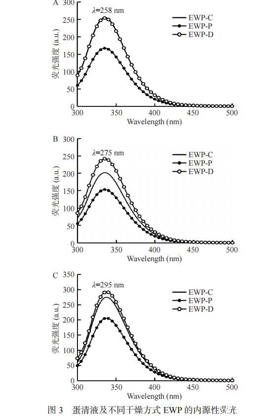蛋白質(zhì)的固有熒光來自于內(nèi)部的芳香族氨基殘基(酪氨酸Tyr、色氨酸Trp、苯丙氨酸Phe),其熒光最大值(λmax)、強度對其微環(huán)境的極性極其敏感,因此可用來表征蛋白質(zhì)的三級結(jié)構(gòu)變化,其中Trp、Tyr和Phe的特有熒光激發(fā)波長分別為295、275和258 nm。如圖3所示,與EWP-C相比,不同干燥方式制備的蛋清粉的固有熒光強度降低但熒光峰的位置未有明顯的遷移。EWP-P的熒光強度低于EWP-D于EWP-C,可能是因為噴霧干燥的干燥溫度高,蛋清蛋白變性程度大,芳香族氨基酸殘基暴露于更極性環(huán)境中,進而發(fā)生了熒光猝滅現(xiàn)象。此外,EWP-P的熒光強度較低還可能是由于蛋清蛋白中含有葡萄糖,在高溫下會與蛋白質(zhì)發(fā)生美拉德反應(yīng),屏蔽了芳香族氨基殘基。