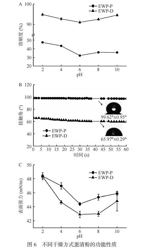 溶解性是蛋白重要的功能特性之一,與接觸角、表面張力、乳化性等密切相關(guān)。如圖6A,不同pH下不同干燥方式的蛋清粉溶解度的測量。EWP-P的溶解度隨著pH的升高先減小后增大,這可能是因為在酸性和堿性環(huán)境中球狀蛋白質(zhì)會發(fā)生部分展開,形成熔融球狀構(gòu)象,變得更加靈活,更容易與水分子作用。pH為6.0時蛋清蛋白的溶解度最低,可能是因為該pH與蛋清蛋白中大部分蛋白的等電點相近,蛋白帶電荷量較少,因此容易發(fā)生沉淀。與EWP-P相比,EWP-D在pH6.0時溶解度的下降程度較小,這可能與真空冷凍干燥后蛋清蛋白的微觀結(jié)構(gòu)呈片狀,具有較大的比表面積有關(guān),也可能是因為冷凍干燥蛋白質(zhì)在脫水過程中蛋白質(zhì)變性低,促進了可溶性聚集物生成。EWP-D的溶解度遠大于EWP-P,這是因為噴霧干燥是直接將蛋清液霧化后再干燥,其蛋清粉表面會形成一個光滑、抗?jié)裥缘谋∧ぃ罱K導(dǎo)致蛋白的溶解性降低,復(fù)水性差且易結(jié)塊。而真空冷凍干燥經(jīng)過冷凍升華,可保持食品原有的形狀故具有很好的速溶性和復(fù)水性。Shaviklo等也發(fā)現(xiàn)噴霧干燥的含添加劑(花粉)蛋白的蛋白質(zhì)溶解度明顯低于凍干蛋白。