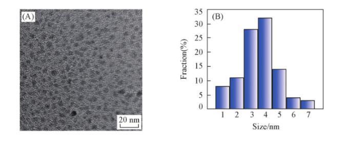 通過傅里葉變換紅外光譜(FTIR)、透射電子顯微鏡(TEM)和X射線衍射(XRD)對DA-GQD的結(jié)構(gòu)進行表征。從FTIR譜圖(圖S1,見本文支持信息)可知,DA-GQD可能包含C—H,O—H,O═C(R)—和C—N基團。從TEM和粒徑分布圖(圖2)可以看出,DA-GQD顆粒比較均勻,基本上為橢球形納米顆粒,粒徑主要分布在1~7 nm,平均粒徑約為3.5 nm。XRD譜圖(圖S2,見本文支持信息)中在20°左右有一個較寬的峰,說明合成的DA-GQD具有石墨烯結(jié)構(gòu)。