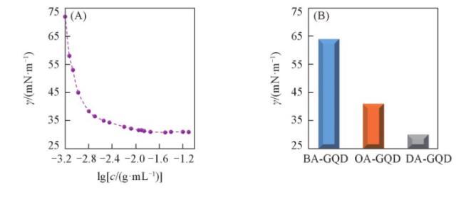 圖3(A)為DA-GQD水溶液的表面張力隨濃度的變化曲線。當溶液中不含DA-GQD時(純水),在25℃下表面張力為72.2 mN/m;在低濃度區(qū)間,溶液表面張力隨著濃度的增加而顯著降低;在高濃度區(qū)間,溶液表面張力曲線在約30.8 mN/m出現(xiàn)一個平臺區(qū)。DA-GQD的臨界膠束濃度約為0.0125 g/mL,表面張力最低降至30.8 mN/m。