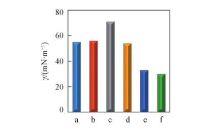 圖4對比了DA-GQD與文獻中常用于穩(wěn)定Pickering乳液的固體顆粒表面活性劑氧化石墨烯(GO)、石墨烯(G)、GQD和氧化亞銅(Cu2O)納米顆粒,以及典型陰離子表面活性劑SDBS的最低表面張力。結(jié)果顯示,GO,G和Cu2O納米顆粒具有較低的水溶性,可以將水的表面張力降低到50~60 mN/m之間,這主要歸因于它們的強疏水性和弱親水性;而且GO和G中的大尺寸石墨烯二維片層容易聚集在流體界面上,增加了界面層的剛性,從而導致其表面活性的進一步降低。而只以檸檬酸作為碳源,通過熱裂解法制備的GQD的表面張力約為71.8 mN/m,接近純水的表面張力。這是因為GQD具有極強的親水性和極弱的疏水性,不合適的兩親結(jié)構(gòu)賦予其低的表面活性。此外,SDBS的表面張力為32.4 mN/m,比DA-GQD水溶液略高一些,證實了DA-GQD的表面活性與SDBS相當。