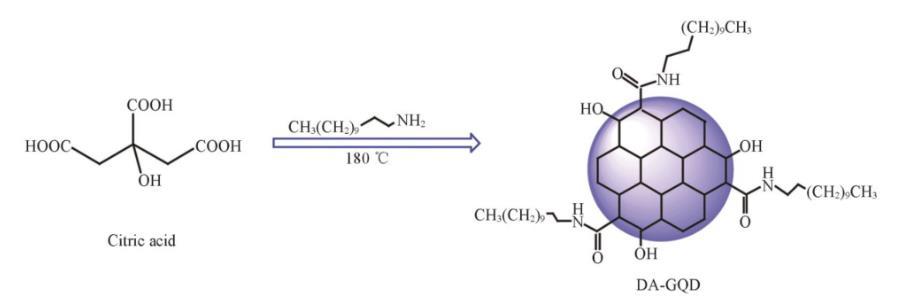 首先采用“自上而下”法,由CX-72炭黑在濃硝酸中回流24 h制備GQD。雖然能夠?qū)崿F(xiàn)一步同時制備單層和多層GQD,但是存在反應時間長、強酸會對環(huán)境造成一定污染等弊端。本實驗設計通過“自下而上”法,以檸檬酸為前驅(qū)體、直鏈烷基胺為功能化試劑,通過一步熱裂解制備雙親性DA-GQD(見圖1)。檸檬酸分子之間脫水縮合形成六邊形sp2碳原子鍵合的石墨烯片,十二胺通過氨基與檸檬酸上的羧基縮合,將烷基鏈引入石墨烯片的邊緣以提高疏水性。