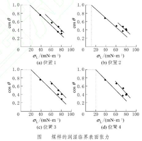 由圖2可知,煤樣不同位置處的臨界表面張力不同,按照式(3)計算得到位置1—4的臨界表面張力依次為:17.1、10.5、19.9、21.1 mN/m,分析其原因主要有2點:一是系統(tǒng)本身所具有的人為誤差的可能;二是測點位置煤樣表面粗糙度不同。因此,成莊礦煤樣的總體臨界表面張力取4個不同位置臨界表面張力值的算術(shù)平均值為17.15mN/m。因此,凡是表面張力低于17.15 mN/m的水都能以零度接觸角潤濕在成莊礦煤體表面上;表面張力大于17.15 mN/m的不同種類水,表面張力越逼近該值的,其對該煤樣的潤濕效果越好,越有利于煤層注水。