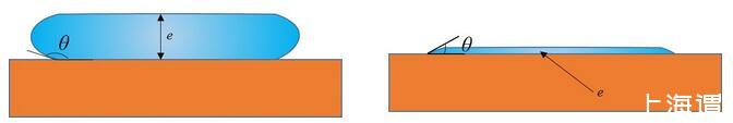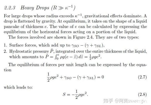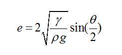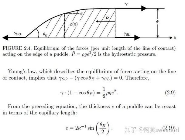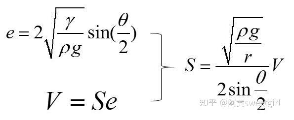 有意思的是,已經(jīng)有前人對(duì)這種情形做過詳細(xì)的受力分析。得出只要接觸角一定,此時(shí)無論加多少水,液體的厚度e都不會(huì)增加,只會(huì)增加鋪展的面積。其厚度e的表達(dá)式為:
