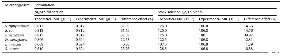 表5儲備溶液NQoTh和Qo/Th混合物的分散對本研究中使用的微生物的添加劑或協(xié)同效應的定量評估。