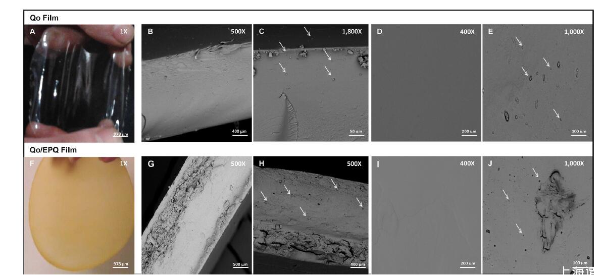 Qo和Qo/EPQ的印刷膜示于圖3A和F。圖3B示出了Qo膜的橫截面,圖3G示出了EPQ/Qo膜的橫截面。Qo膜具有均勻、柔軟、光滑、連續(xù)的結(jié)構(gòu),具有良好的完整性和孔隙。相比之下,混合膜具有帶有孔隙和裂縫的異質(zhì)結(jié)構(gòu)。Qo-乳清蛋白薄膜(Kurek、Galus和Debeaufor,2014年)和Qo-明膠薄膜(Kurek等人,2012年;Rivero、García和Pinotti,2009年;Torres、Aimoli、Beppu和弗雷利希,2005年)。這些作者將這些由碳水化合物和蛋白質(zhì)混合物制備的薄膜的異質(zhì)結(jié)構(gòu)歸因于干燥過程(溶劑前沿的遷移)。Qo/EPQ薄膜的干燥時間是Qo薄膜的1.8倍,表明水分子通過混合薄膜的擴散速度較慢。此外,混合物的pH值(pH 3.8)接近藜麥蛋白的等電點(Abugoch,Romero,Tapia,Rivera,&Silva,2008),這可能會引發(fā)復雜的凝聚和某些蛋白質(zhì)組分的沉淀,導致Ferreira等人描述的熱力學不相容性。(2009),當乳清蛋白和Qo的混合物被酸化以獲得混合膜時,他觀察到了這種現(xiàn)象。